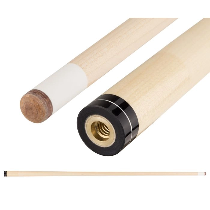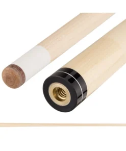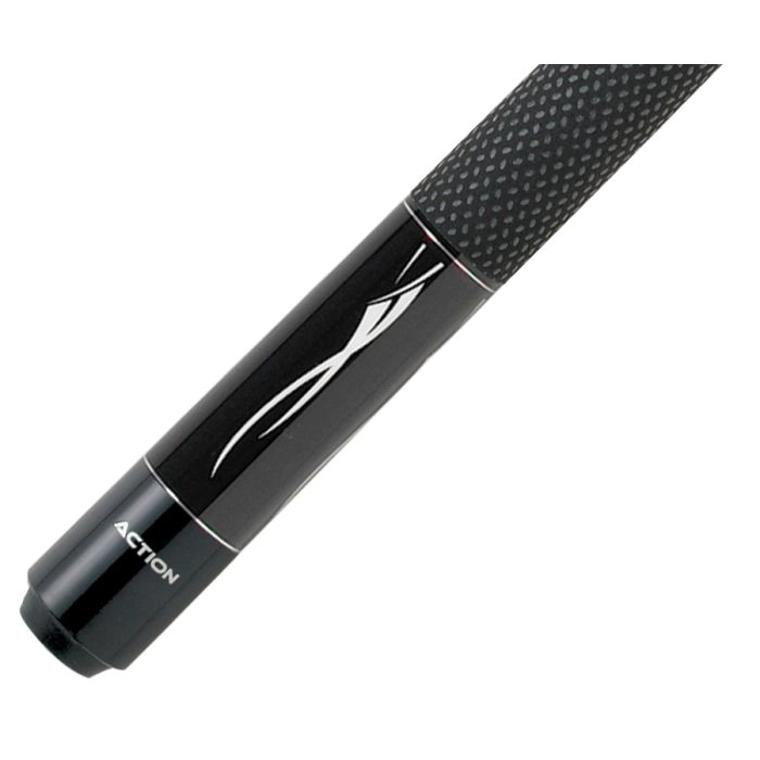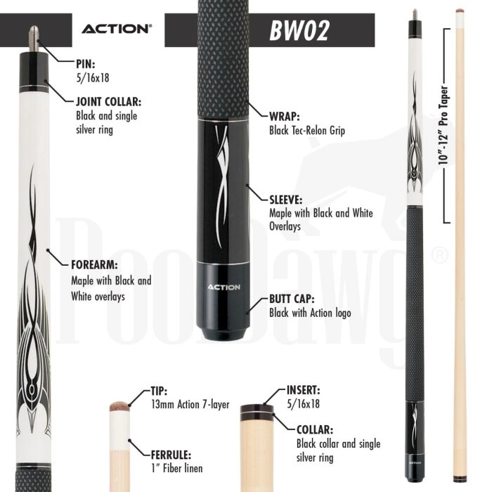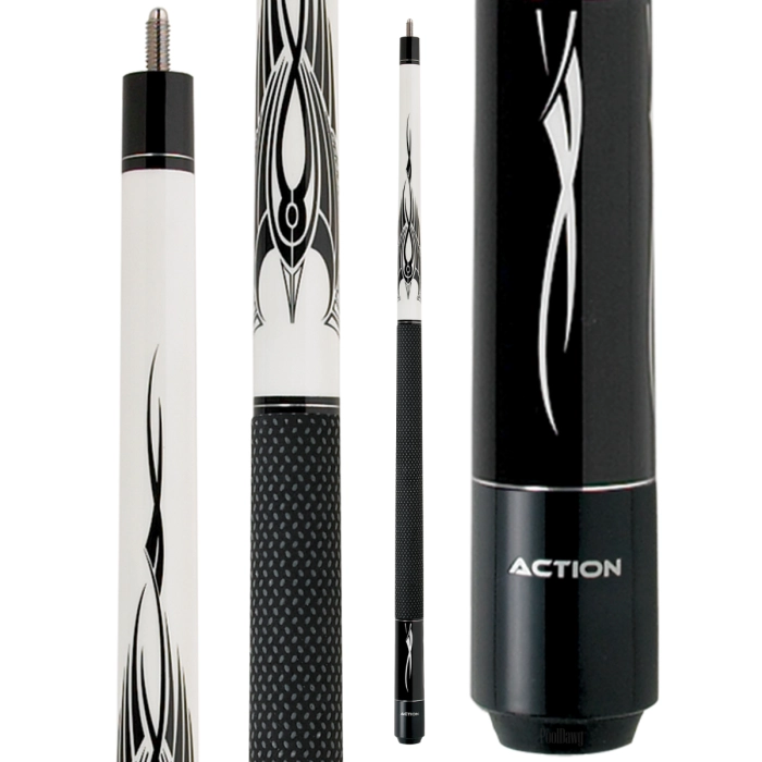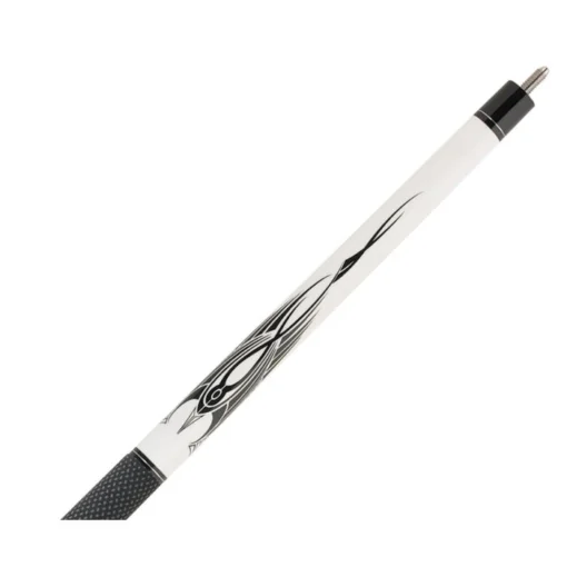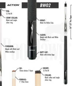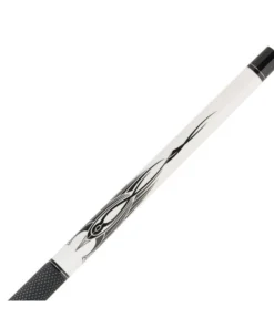 The Action BW02 Black & White maple pool stick takes on somewhat of a Native American flair with the black bird-like symbol on the white forearm. In contrast, the sleeve is black with a white pattern pulled from the forearm design. A black Tec-Relon wrap ties the two sections together. This cue incorporates superior materials, such as a proprietary tip and composite collar joint.
