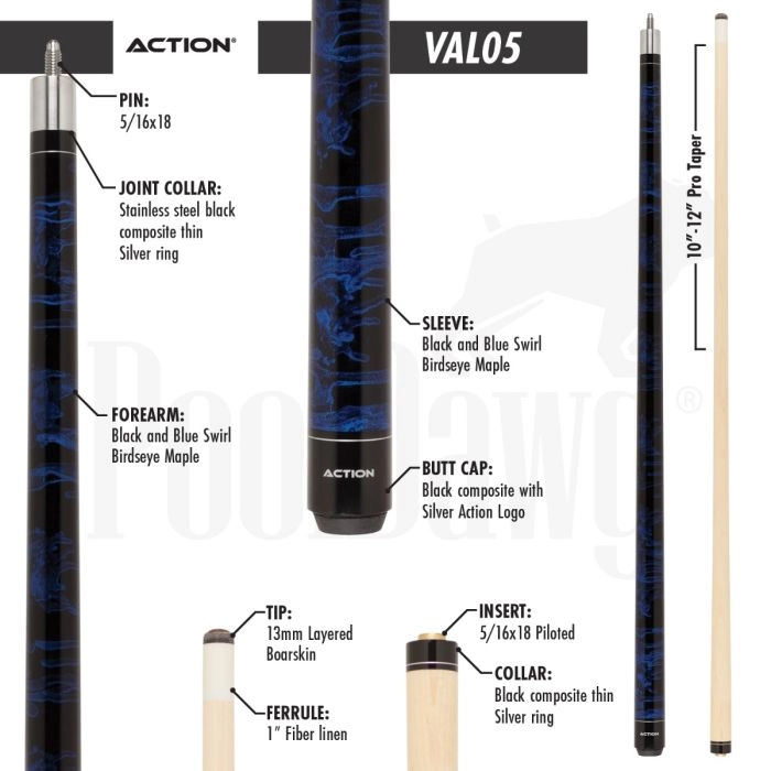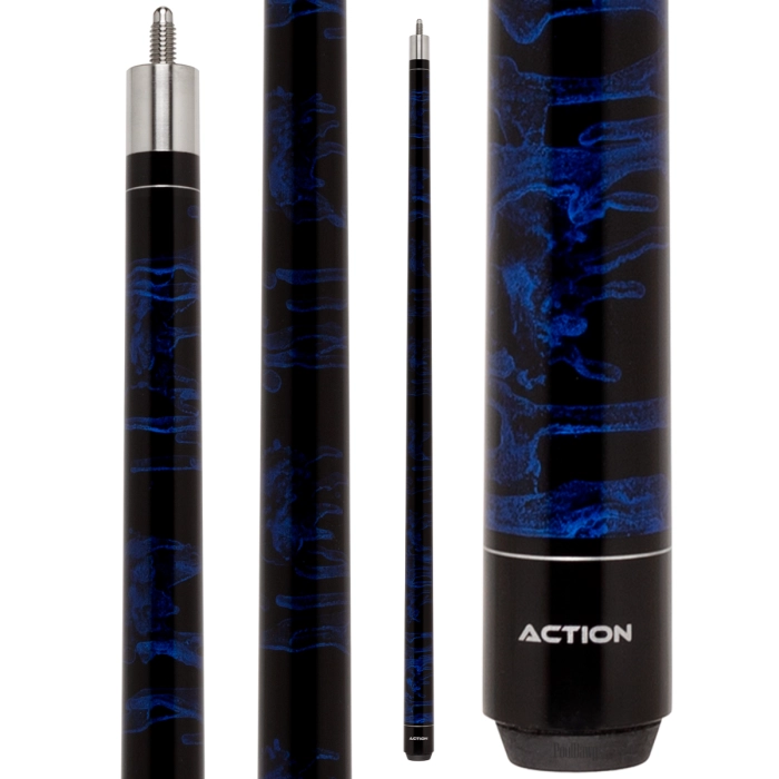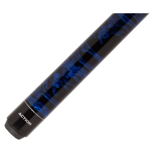 The sea of blue swirl on the Action Value 05 cue is sure to have a calming effect on your game. The soothing use of blue and black stain on Birdseye Maple is topped off with a stainless steel collar, which leads to the hardrock maple shaft. A piloted joint provides the compact, solid hit preferred by beginners to advanced level players. All of this quality craftsmanship is offered at a very reasonable price. Satisfaction is guaranteed with all Action cues.