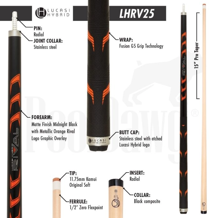 Lucasi Hybrid’s patent-pending technologies combine a Zero Flex Point ferrule, Total Sweet Spot Construction, G5 Grip Technology and the X-Shox Dampening System to give you a cue with unsurpassed accuracy and forgiveness that’s consistent no matter what – whether it’s a hard break or a soft finesse shot.