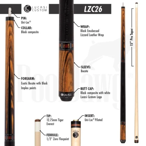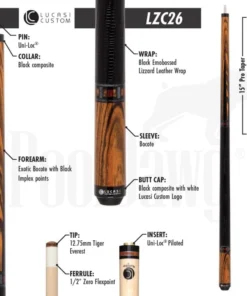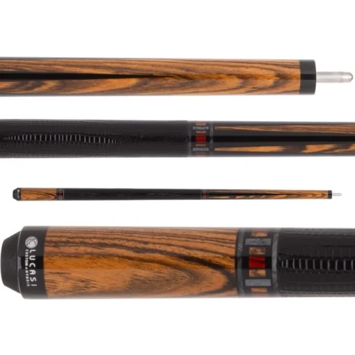 Indulge in the elegance and precision of the Lucasi Custom Cue. Crafted with meticulous attention to detail, this cue showcases an exquisite combination of exotic Bocote and black Implex points on the forearm, exuding sophistication and style. Enhancing both aesthetics and performance, the black embossed lizzard leather wrap provides a luxurious feel and confident grip. With a Tiger Everest tip, this cue delivers exceptional control and accuracy, empowering you to dominate the game with finesse. Experience the artistry and excellence of Lucasi Custom Cue, a true masterpiece in billiards.